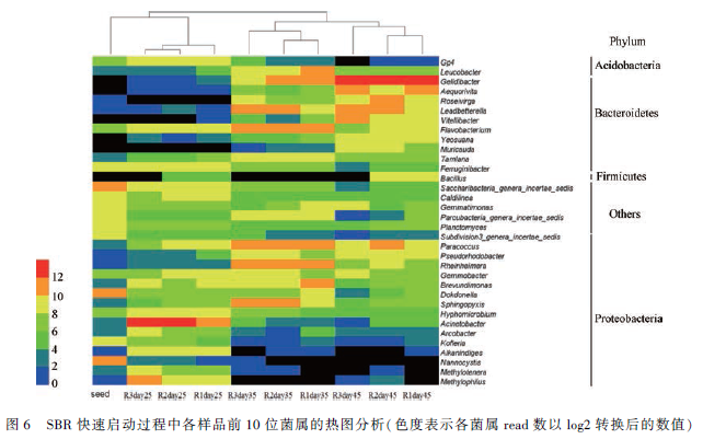 對SBR 中活性污泥進行了高通量測序用于揭示反應器菌群結構演替以及復合菌劑的存留狀況。群落結構分析的4 組實驗包括配入高鹽廢水前期(R1、R2 和R3 完成接種后在相同條件下運行,樣品編號Rday15),連續投加復合菌劑的R1 組(樣品編號R1 day25、R1 day35、R1 day45),連續投加復合菌劑的固定化填料的R2 組(樣品編號R2 day25、R2 day35、R2 day45);連續投加活性污泥的R3 組(樣品編號R3day25、R3 day35、R3 day45)。不同處理組及采樣階段,菌門水平變化如圖5 所示?;钚晕勰辔⑸镏泻枯^多的為變形菌門( Proteobacteri) 和擬桿菌門( Bacteroidetes),其所占比例較高,分別達到40. 45% 、27. 05% 、4. 69% 和4. 22% 。在整個生物處理啟動過程中,高鹽廢水對活性污泥的馴化以及復合菌劑的投入使活性污泥微生物群落結構發生了明顯的改變。活性污泥中主要微生物比例發生了明顯改變,R1、R2 和R3 中變形菌門所占比例均出現驟增,分別達到56. 24% 、56. 22% 和63. 72% ,擬桿菌門所占比例則分別降低至16. 11% 、19. 40% 和17. 68% 。對于R1 和R2,從運行第10 天至15 天連續投加了復合菌劑和負載復合菌劑的填料,所以R1 和R2 中厚壁菌門所占比例從1. 31% 分別升高至6. 13% 和4. 54% ;對于R3,由于僅投入活性污泥種泥,其中的厚壁菌門所占比例在運行45 d 僅有0. 95% 。這說明地衣芽孢桿菌(Bacillus licheniformis) O1 和枯草芽孢桿菌(Bacillus subtilis) Y5 所屬的厚壁菌門雖然具有較強的耐鹽性,但不具備競爭優勢,通過復合菌劑投加,可以在活性污泥總富集,并成為優勢種屬。